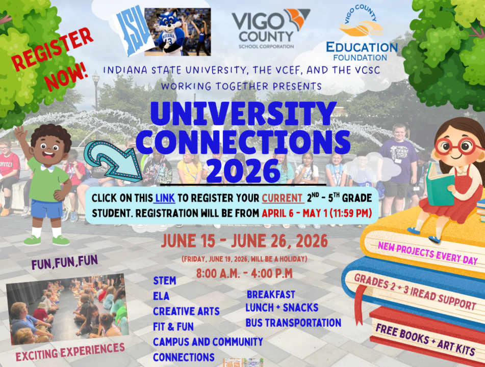 During select weeks in June, students in grades 2-5 can attend University Connections. Free of charge! Registration closes on May 1. University Connections is an in-person summer adventure, offered to students currently in grades 2-5, free of charge. The nine-day program at Indiana State University (ISU) is from 8:00 a.m. – 4:00 p.m. University Connections programming will also include IREAD remediation for grades 2 and 3.Transportation will be provided to and from each student’s home school. (*Please note if your place of employment or home is closer to a different elementary school, rather than the one your student attends, our team will accommodate this request. This can be indicated in the transportation drop down selections below, and we understand the morning and afternoon bus transportation locations could be different).