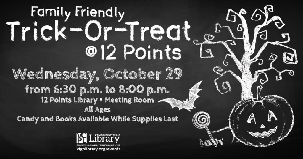 Wednesday, October 29. Family Friendly Trick or Treat at VCPL 12 Points. All Ages: Visit 12 Points Library’s Family Friendly Trick-Or-Treat for candy and a new book! Books available while supplies last.