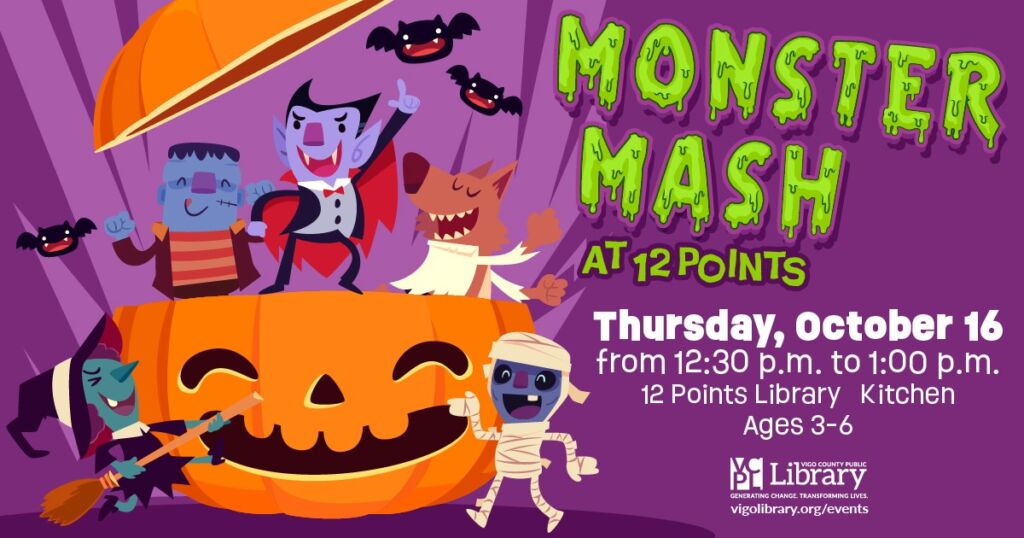 Thursday, October 16. Monster Mash at VCPL 12 Points. Ages 3–6: Is your mad scientist eager to create their own monster from scratch? Enter the lab at 12 Points Library to combine popsicle sticks and accessories into a custom creation worthy of Dr. Frankenstein!