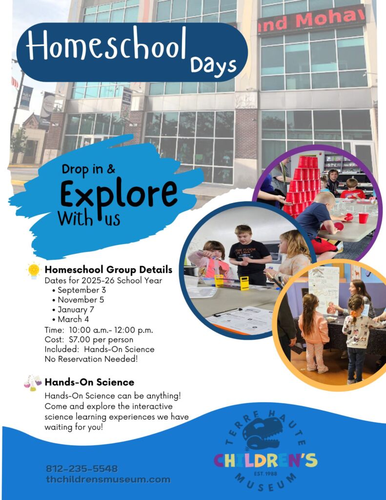 Wednesday, January 7. Homeschool students are invited to a “field trip” at the Terre Haute Children’s Museum! Grab your fellow homeschool friends, come by and you’ll receive field trip pricing at the door. No reservation is necessary.