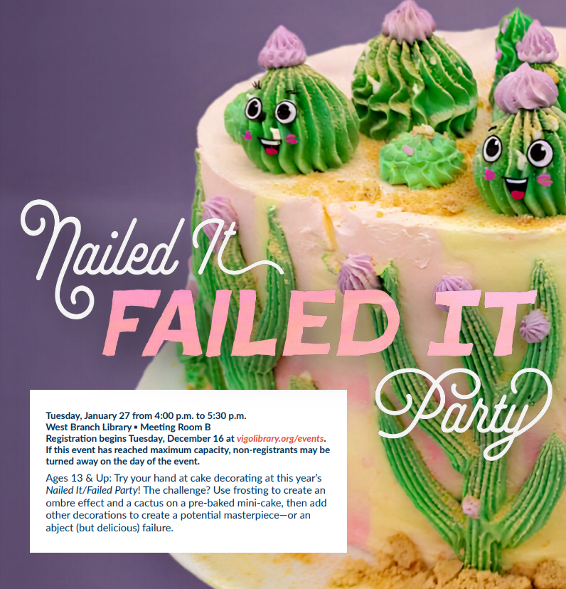 Tuesday, January 27. Nailed It/Failed It Party at VCPL West. Ages 13 & Up: Try your hand at cake decorating at this year’s Nailed It/Failed Party! The challenge? Use frosting to create an ombre effect and a cactus on a pre-baked mini-cake, then add other decorations to create a potential masterpiece—or an abject (but delicious) failure.