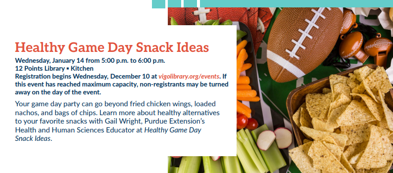 Wednesday, January 14. Healthy Game Day Snack Ideas at VCPL 12 Points.