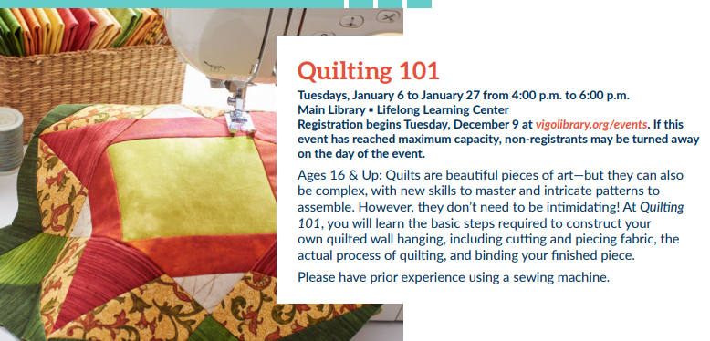 Tuesday, January 6.Quilting 101 at VCPL Main. Ages 16 & Up: Quilts are beautiful pieces of art—but they can also be complex, with new skills to master and intricate patterns to assemble. However, they don’t need to be intimidating! At Quilting 101, you will learn the basic steps required to construct your own quilted wall hanging, including cutting and piecing fabric, the actual process of quilting, and binding your finished piece. Please have prior experience using a sewing machine.