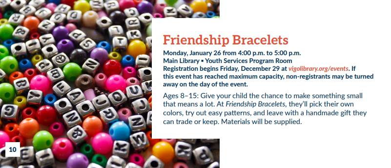 Monday, January 26. Make friendship bracelets at VCPL Main!