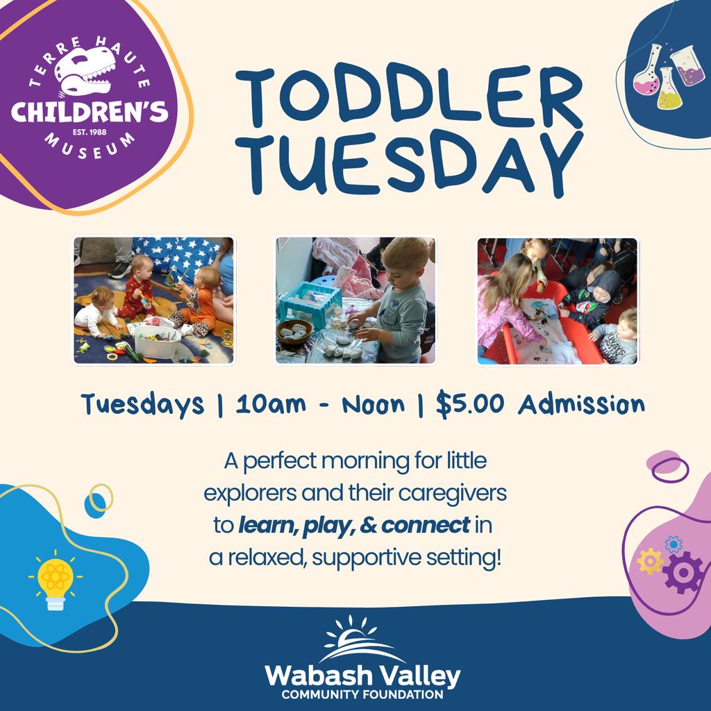 Tuesdays. Toddler Tuesday at the Terre Haute Children’s Museum. Drop-in for a couple hours of your toddlers interacting and playing with one another! And, it’s just $5 per person, thanks to a generous grant from the Vigo County Community Foundation.